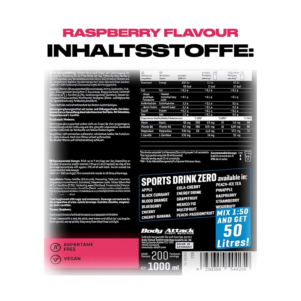 Das Body Attack Zero Sports Drink Konzentrat in Himbeere ist ein funktionelles Getränk, das speziell für sportliche Aktivitäten entwickelt wurde. Es enthält essentielle Vitamine, Magnesium und L-Carnitin, um die Leistungsfähigkeit zu unterstützen. Das Konzentrat ist vegan, zucker- und fettarm und wird in Deutschland hergestellt, was für hohe Qualität und kurze Lieferwege steht.